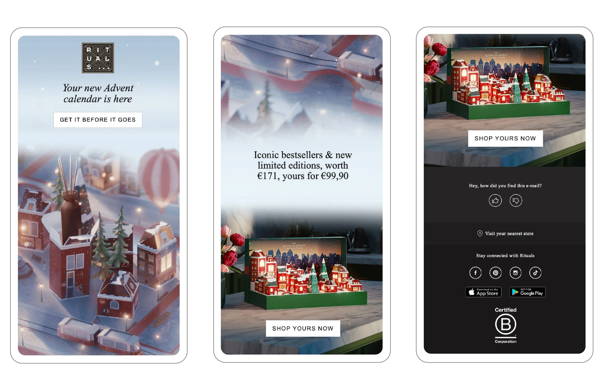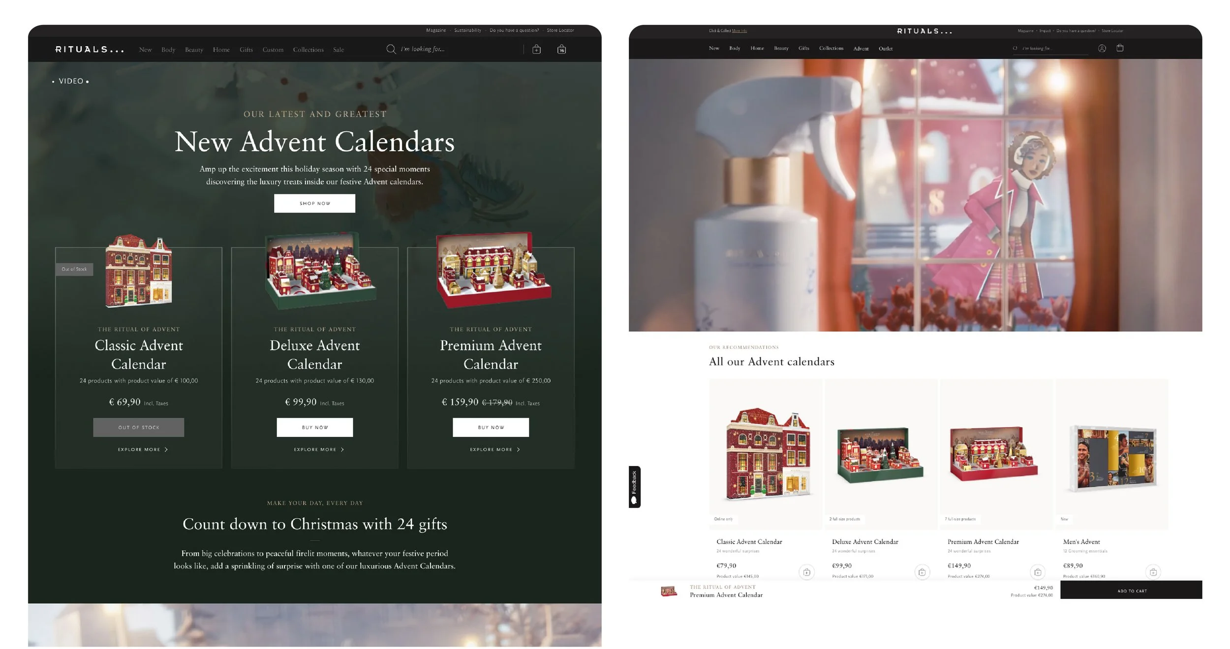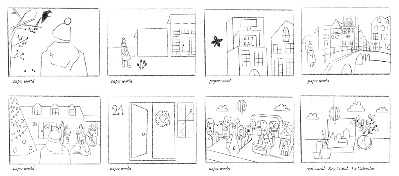 Concept and art direction for the global Rituals Advent 2024 campaign. Inspired by one of the brand themes ‘awareness’ we follow a female character on a journey of discovery as she explores the paper world of advent. As soon as she sees the beauty in the smallest of things, the world around her bursts into full color revealing a magical world of Rituals products.